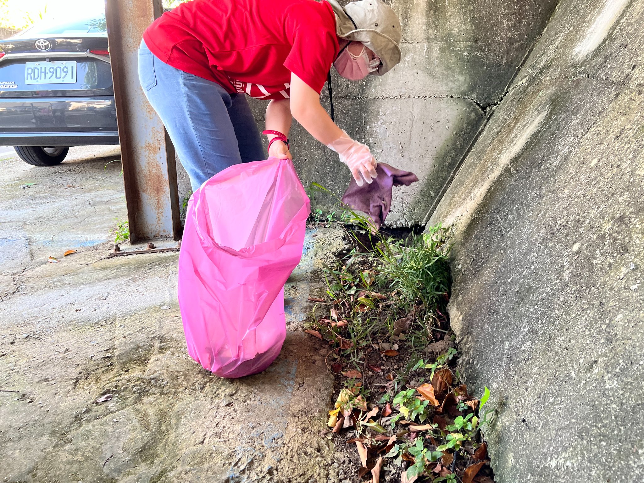外出打掃都會配戴口罩、遮陽帽。